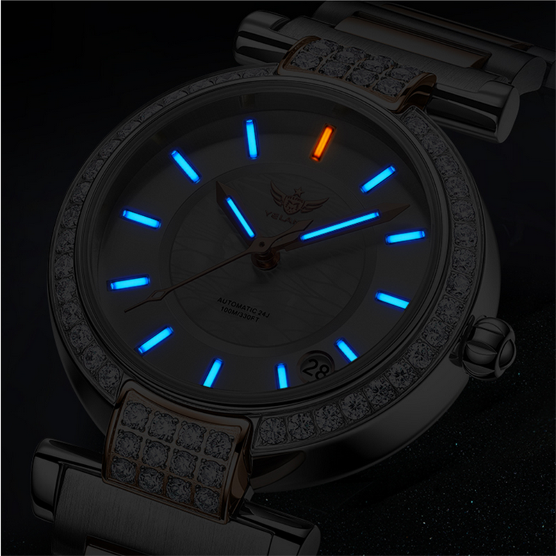 The ladies luxury watches with Swiss T100 Tritium Tubes, which have super bright effect in dark. The crown with screw in waterproof design. the mirror is equipped with high-grade synthetic sapphire mirror, the bezel with 58pcs Austria crystals, professional level 100M waterproof, which is suitable for dive, swimming, sport, business etc. the lady automatic watch is equipped with Japan seiko 24 Jewels automatic movement, the accuracy is +- 10 seconds / day, stable and reliable. as the same time, it also shows the excellent overall quality.