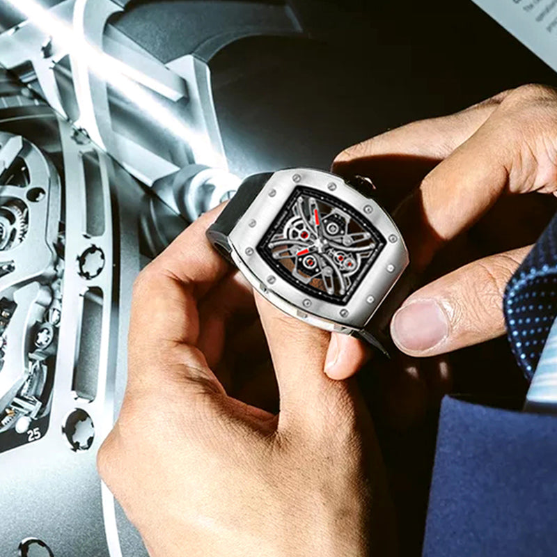 Skeleton Automatic Watch: The barrel-shaped design of the watch is based on the arc geometry that fits the wrist best, and is more comfortable when used. The workings are laid bare on the skeleton dial, allowing you to see the movement directly.