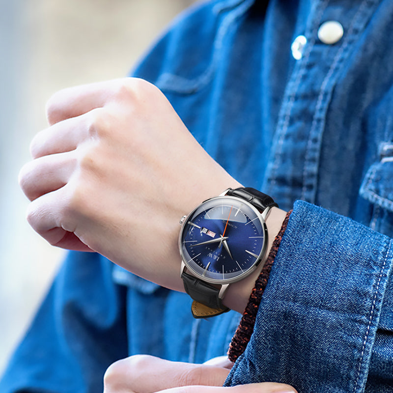 Movement: Japanese automatic movement, 40-hour power reserve. 3D curved mirror is the hardest, most durable, so it's scratch-resistant,clean and transparent.Strap: Italian cowhide, flexible and delicate, giving you a comfortable wearing feeling. The powerful pin buckle adopts a small but strong pin buckle design, which is convenient for wrist movement and makes the strap more comfortable to wear. The adjustable length ranges from 165mm to 200mm (6.4 inches to 7.87 inches), and is easy to use and safe.